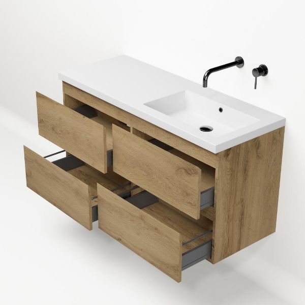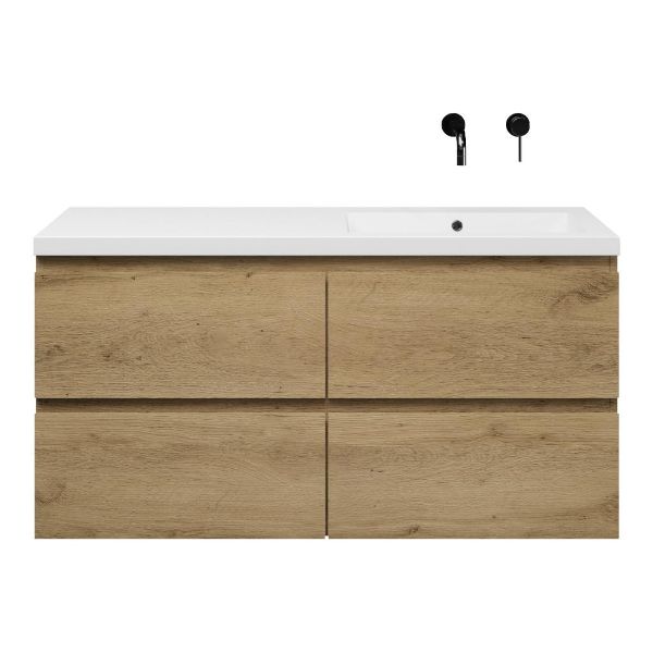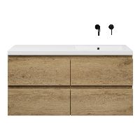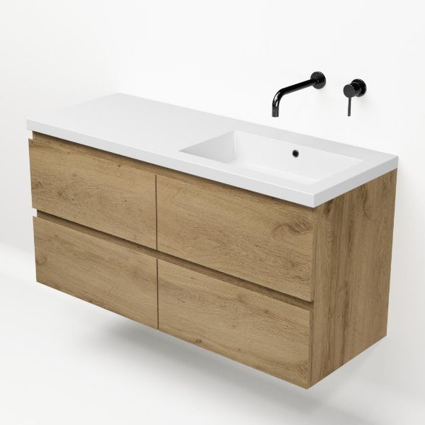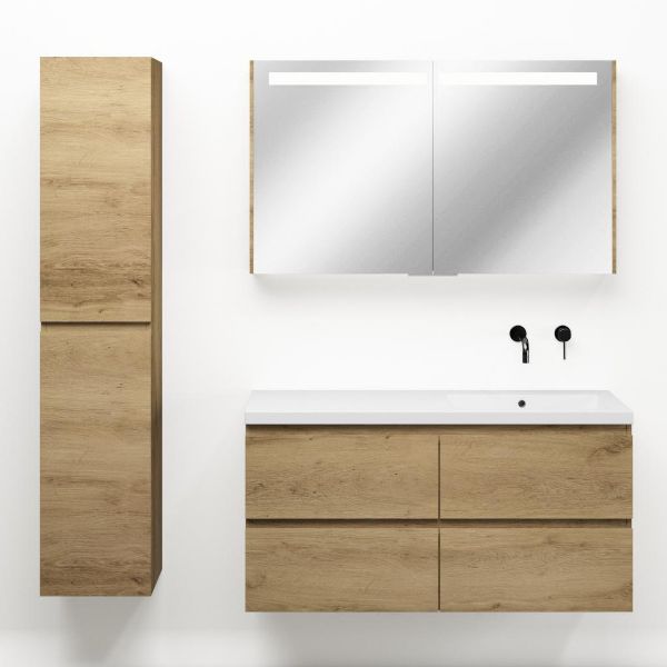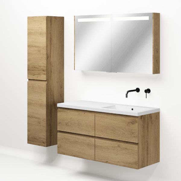 Greeploos badkamermeubel in de kleur eiken warm is 120 cm breed.  De wastafel is vervaardig in polystone en heeft de kleur wit. Dit badkamermeubel met deze wastafel is leverbaar tussen de 60 cm t/m 200 cm