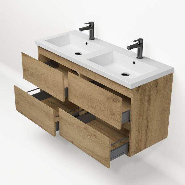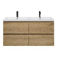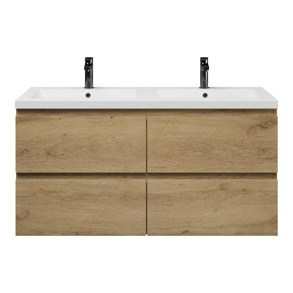 | | Bellanti Gisella/Esta-Q badmeubel 120x46 4 softclose laden warm eiken greeploos quartz wastafel dubbel mat wit met 2 kraangaten |