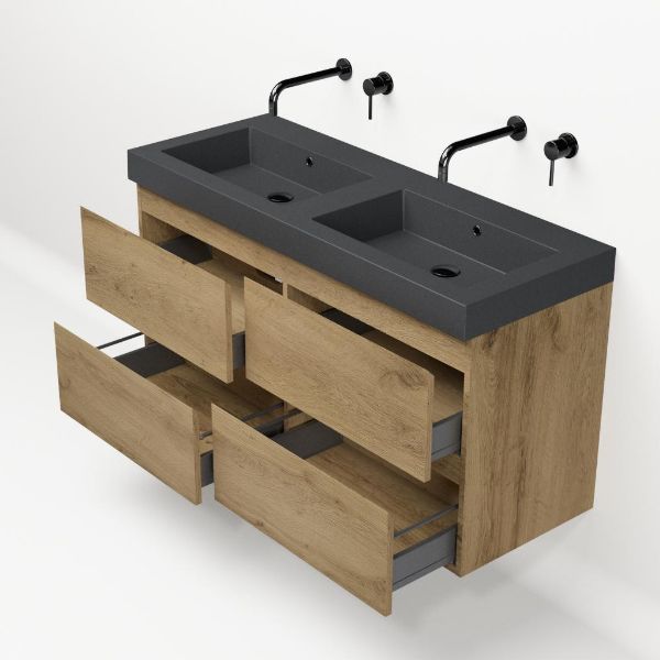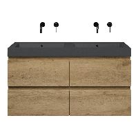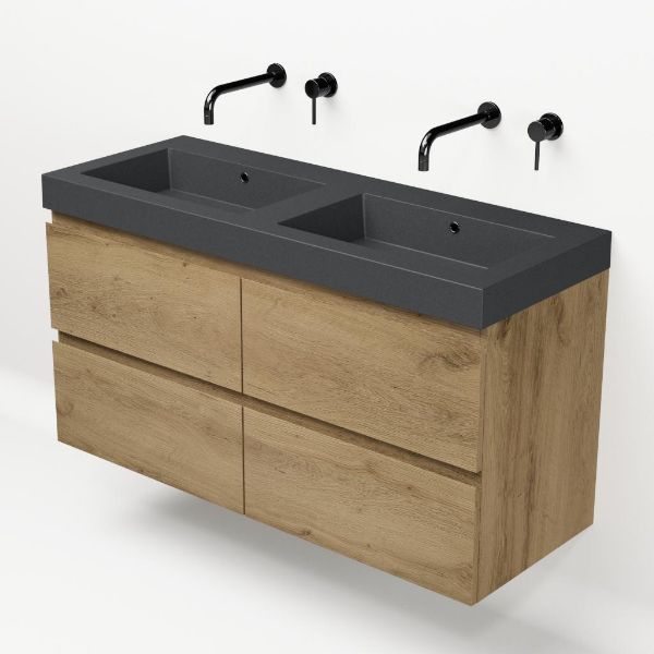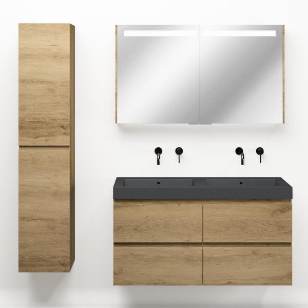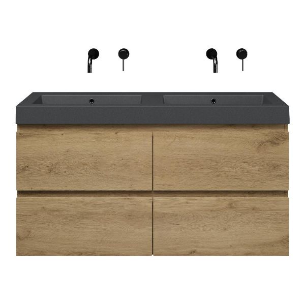 | | Bellanti Gisella/Esta-Q badmeubel 120x46 4 softclose laden warm eiken greeploos quartz wastafel dubbel mat grijs zonder kraangaten |