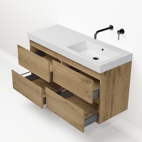 | Bellanti Gisella/Esta-Q badmeubel 120x46 4 softclose laden warm eiken greeploos quartz wastafel mat wit rechts zonder kraangaten |