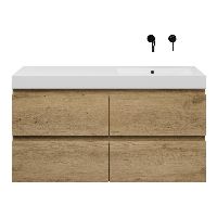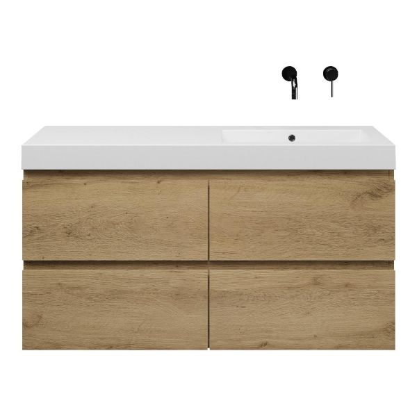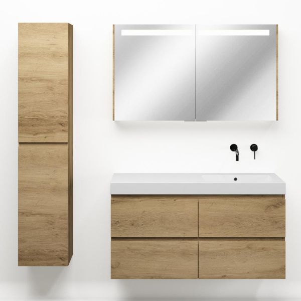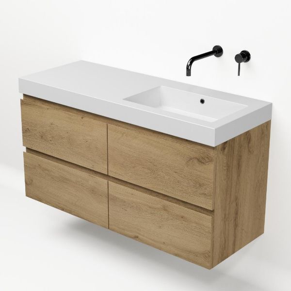 | | Bellanti Gisella/Esta-Q badmeubel 120x46 4 softclose laden warm eiken greeploos quartz wastafel mat wit rechts zonder kraangaten |