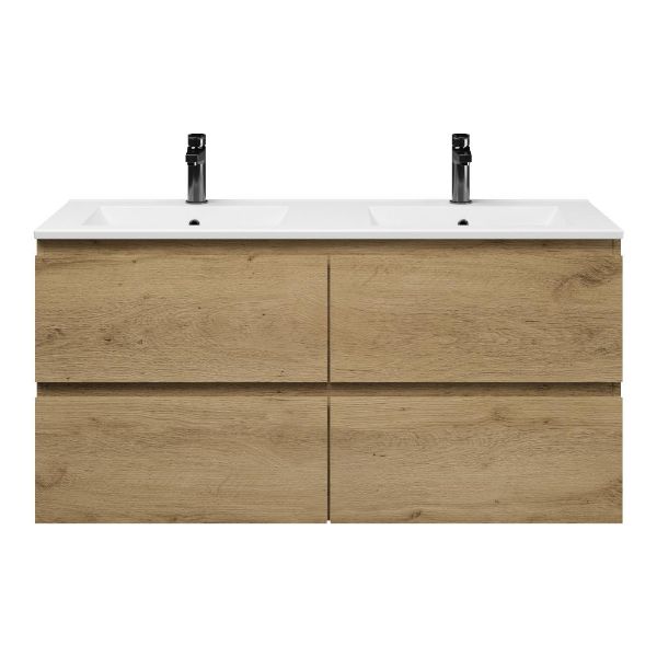 | | Bellanti Gisella/Faro badmeubel 120x46 4 softclose laden warm eiken greeploos keramische wastafel dubbel wit met 2 kraangaten |