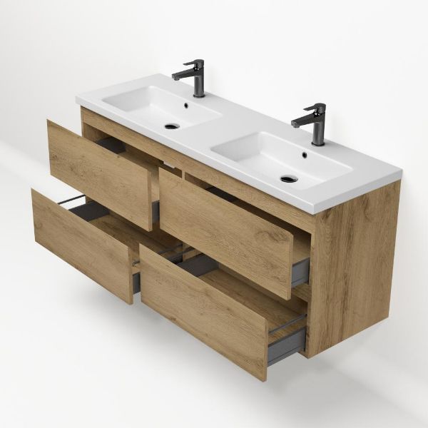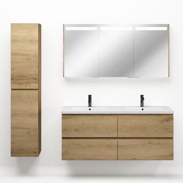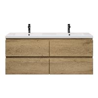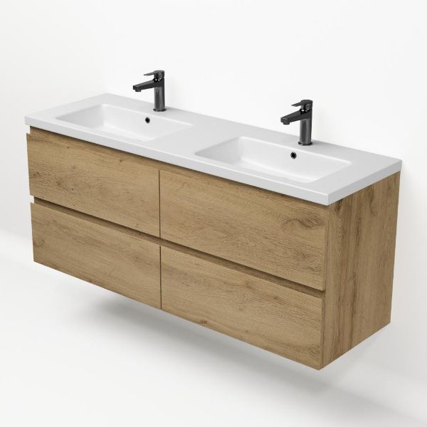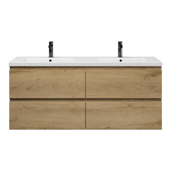 | | Bellanti Gisella/Amelia badmeubel 140x46 4 softclose laden warm eiken greeploos keramiek wastafel dubbel mat wit met 2 kraangaten |