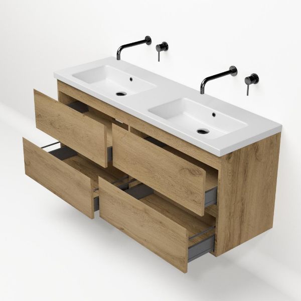 | | Bellanti Gisella/Amelia badmeubel 140x46 4 softclose laden warm eiken greeploos keramiek wastafel dubbel mat wit zonder kraangaten |