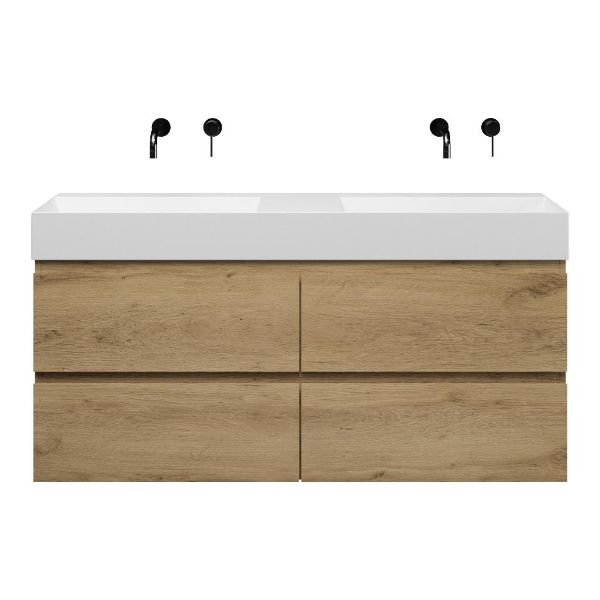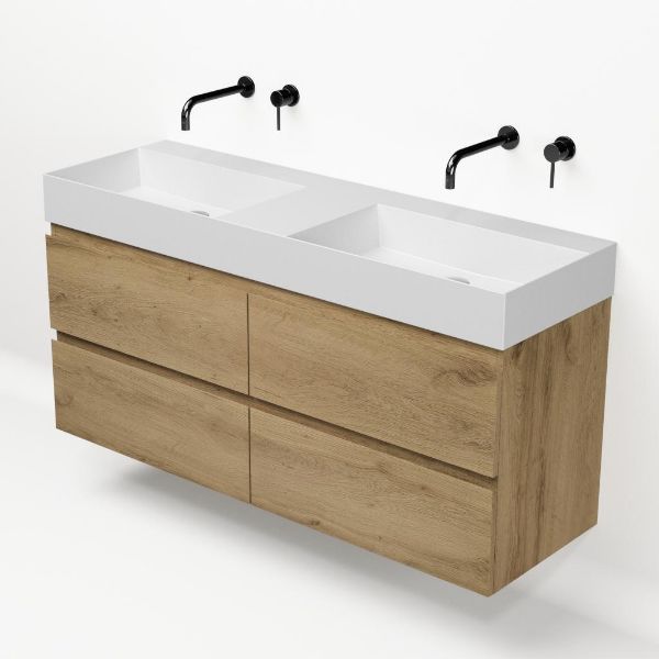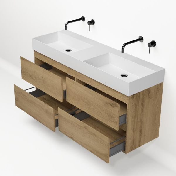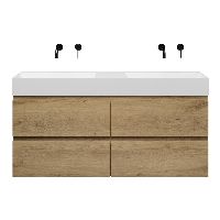 | | Bellanti Gisella/Azzurra badmeubel 140x46 4 softclose laden warm eiken greeploos keramische wastafel dubbel wit mat zonder kraangaten |
