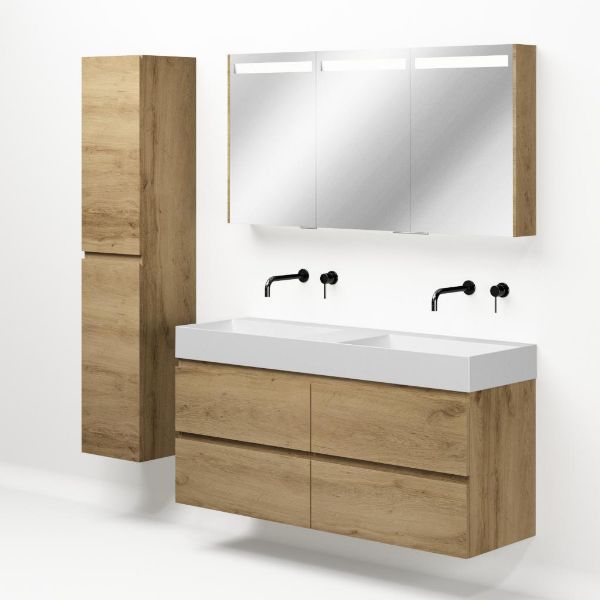 Greeploos badkamermeubel in de kleur eiken warm is 140 cm breed. De wastafel is vervaardig in keramiek en heeft de kleur wit mat keramiek. Dit badkamermeubel met deze wastafel is leverbaar tussen de 60 cm t/m 160 cm