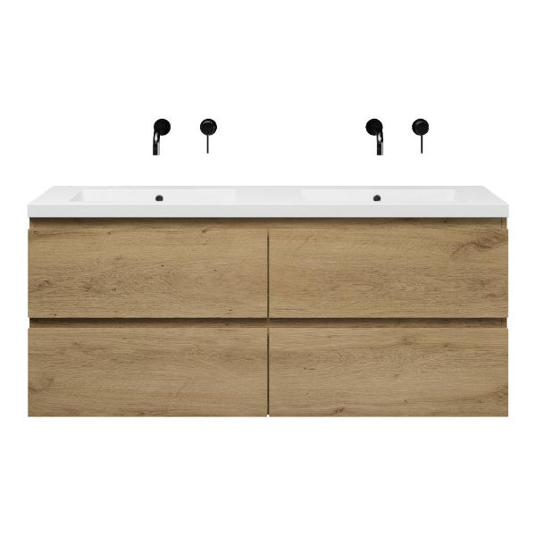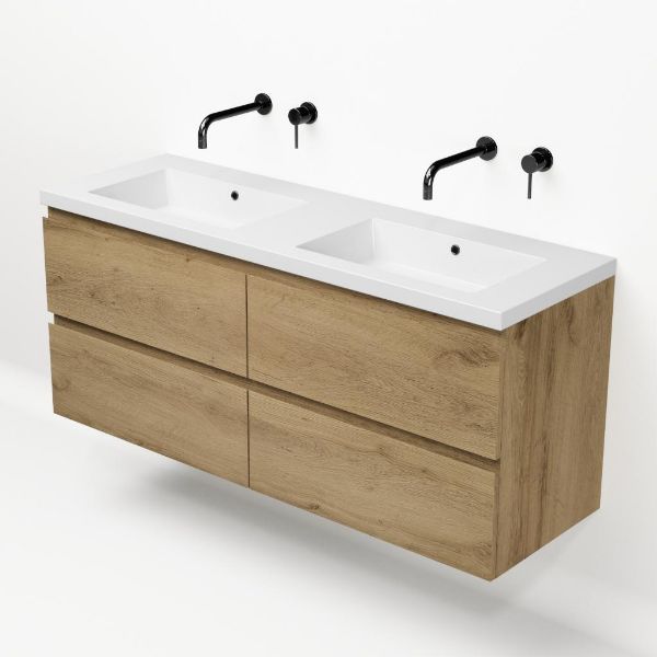 Bellanti Gisella/Esta badmeubel 140x46 4 softclose laden warm eiken greeploos polystone wastafel dubbel wit zonder kraangaten