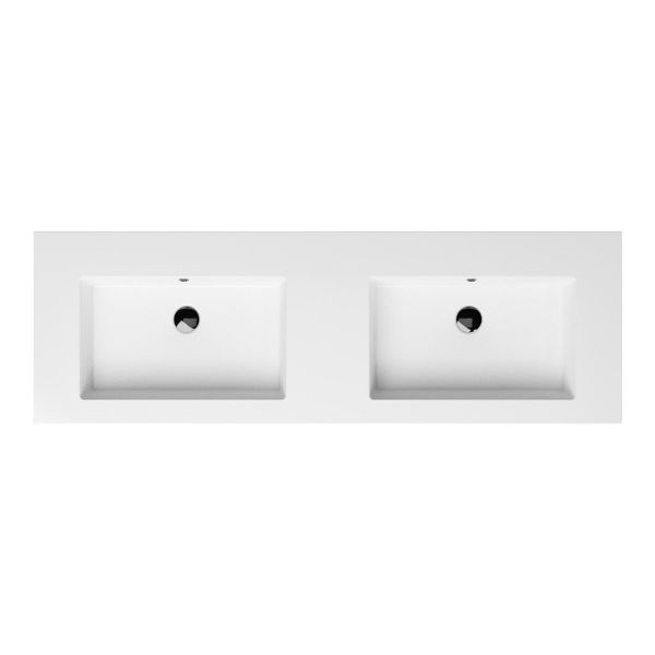Greeploos badkamermeubel in de kleur eiken warm is 140 cm breed.  De wastafel is vervaardig in polystone en heeft de kleur wit. Dit badkamermeubel met deze wastafel is leverbaar tussen de 60 cm t/m 200 cm