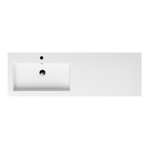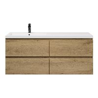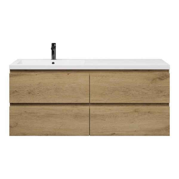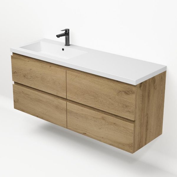 Greeploos badkamermeubel in de kleur eiken warm is 140 cm breed. De wastafel is vervaardig in polystone en heeft de kleur wit. Dit badkamermeubel met deze wastafel is leverbaar tussen de 60 cm t/m 200 cm