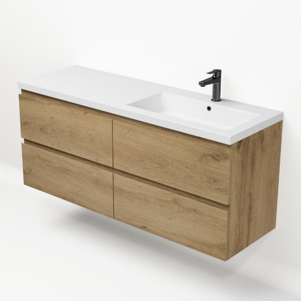 Greeploos badkamermeubel in de kleur eiken warm is 140 cm breed. De wastafel is vervaardig in polystone en heeft de kleur wit. Dit badkamermeubel met deze wastafel is leverbaar tussen de 60 cm t/m 200 cm