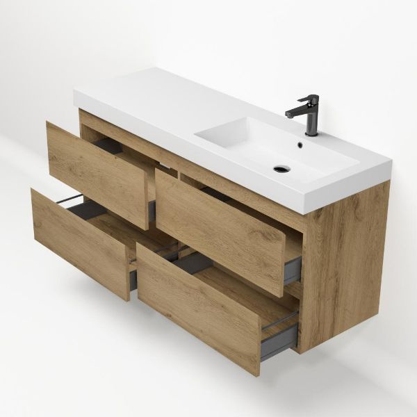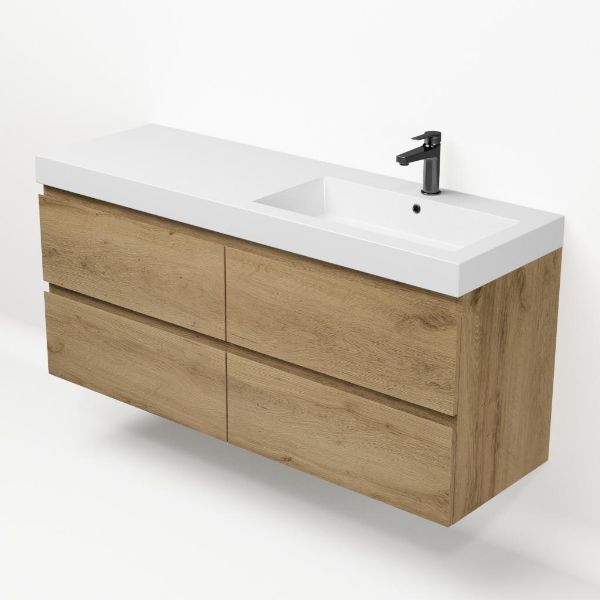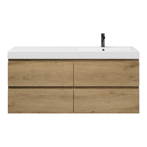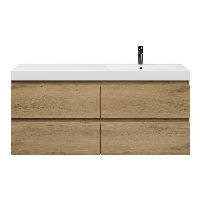 Greeploos badkamermeubel in de kleur eiken warm is 140 cm breed. De wastafel is vervaardig in polystone en heeft de kleur wit. Dit badkamermeubel met deze wastafel is leverbaar tussen de 60 cm t/m 200 cm