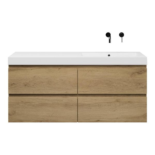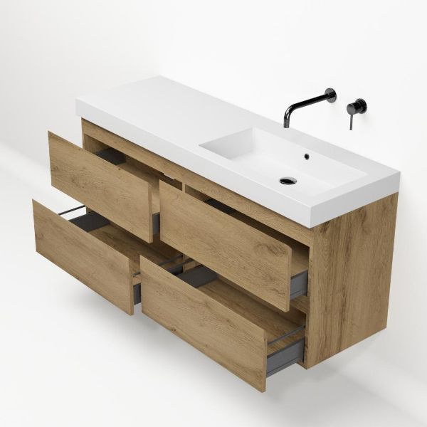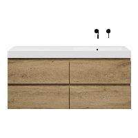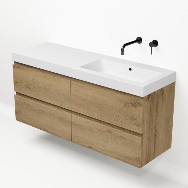 Greeploos badkamermeubel in de kleur eiken warm is 140 cm breed.  De wastafel is vervaardig in polystone en heeft de kleur wit. Dit badkamermeubel met deze wastafel is leverbaar tussen de 60 cm t/m 200 cm