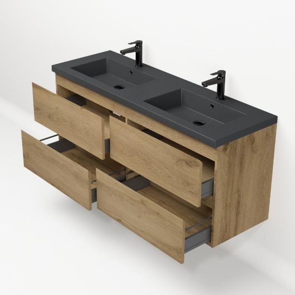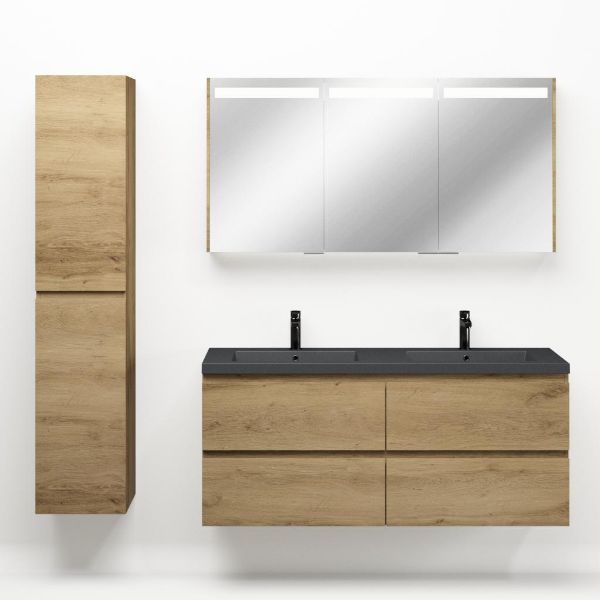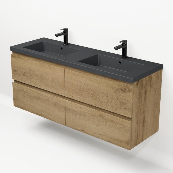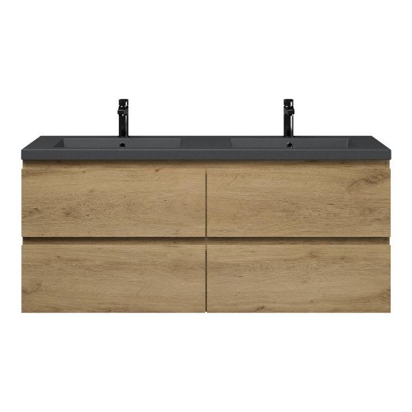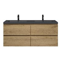 Bellanti Gisella/Esta-Q badmeubel 140x46 4 softclose laden warm eiken greeploos polystone wastafel dubbel mat grijs met 2 kraangaten
