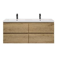 Greeploos badkamermeubel in de kleur eiken warm is 140 cm breed.  De wastafel is vervaardig in quartz en heeft de kleur wit mat. Dit badkamermeubel met deze wastafel is leverbaar tussen de 60 cm t/m 200 cm