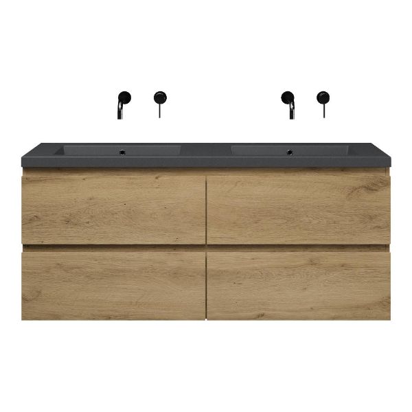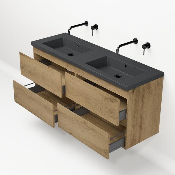 | Bellanti Gisella/Esta-Q badmeubel 140x46 4 softclose laden warm eiken greeploos quartz wastafel dubbel mat grijs zonder kraangaten |
