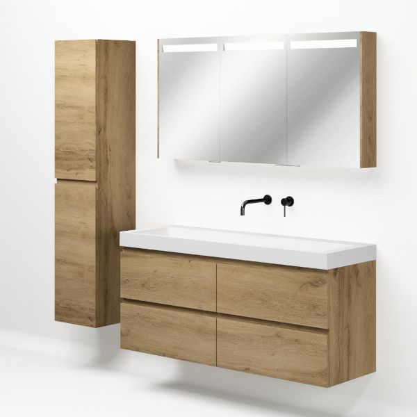 Greeploos badkamermeubel in de kleur eiken warm is 140 cm breed. De wastafel is vervaardig in polystone en heeft de kleur wit. Dit badkamermeubel met deze wastafel is leverbaar tussen de 60 cm t/m 140 cm