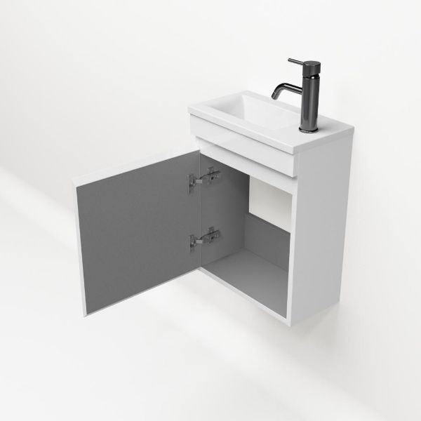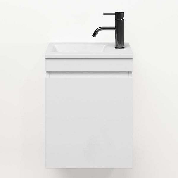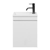 Greeploos fonteinmeubel in de kleur wit hoogglans is 40 cm breed. De wastafel is vervaardig in polystone en heeft de kleur wit keramiek met 1 kraangaten