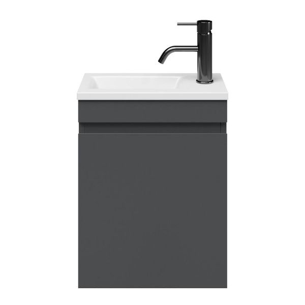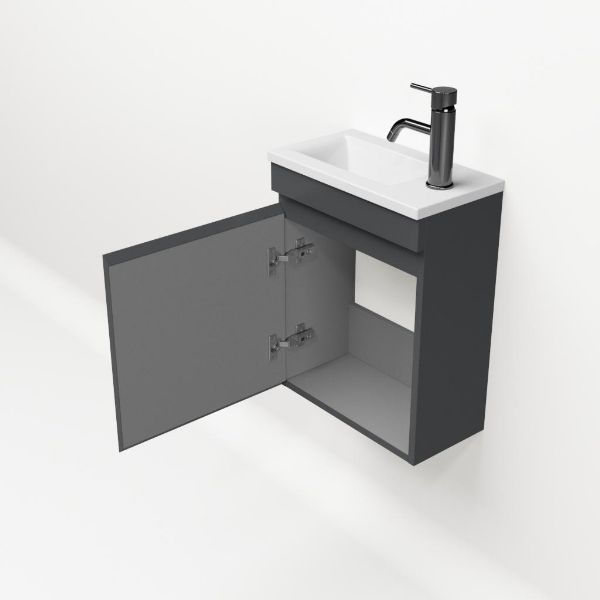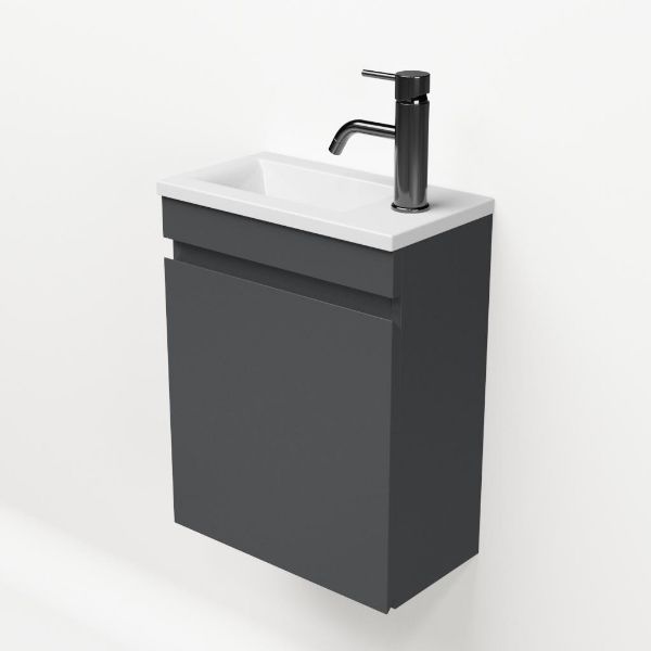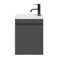 Greeploos fonteinmeubel in de kleur antraciet mat is 40 cm breed. De wastafel is vervaardig in polystone en heeft de kleur wit keramiek met 1 kraangaten