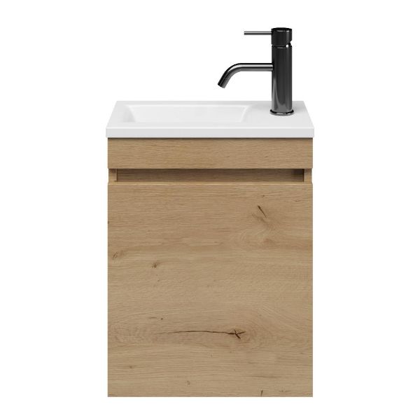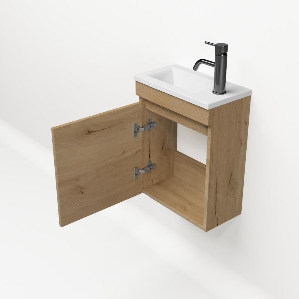 Greeploos fonteinmeubel in de kleur eiken natuur is 40 cm breed. De wastafel is vervaardig in polystone en heeft de kleur wit keramiek met 1 kraangaten