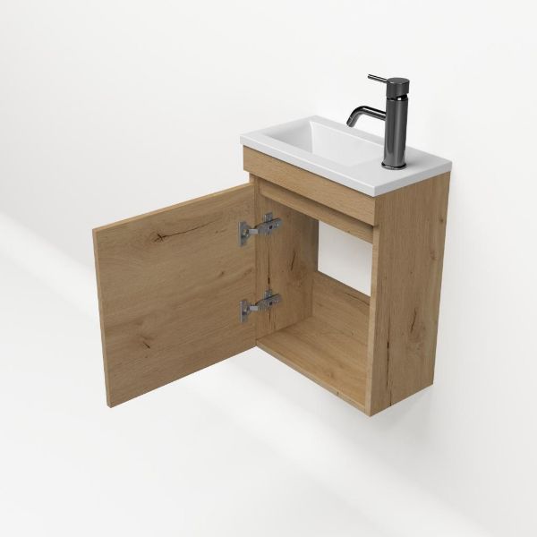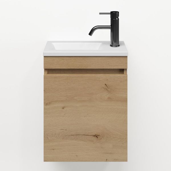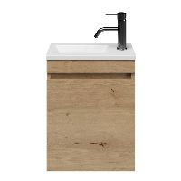 Greeploos fonteinmeubel in de kleur eiken natuur is 40 cm breed. De wastafel is vervaardig in polystone en heeft de kleur wit mat keramiek met 1 kraangaten