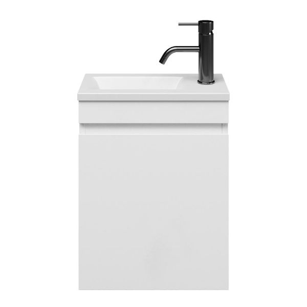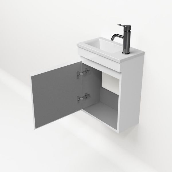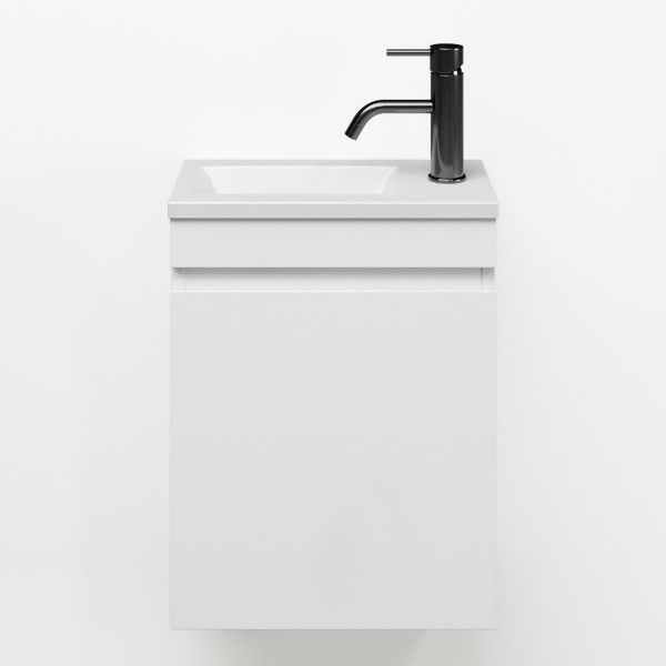 Greeploos fonteinmeubel in de kleur wit hoogglans is 40 cm breed. De wastafel is vervaardig in polystone en heeft de kleur wit mat keramiek met 0 kraangaten