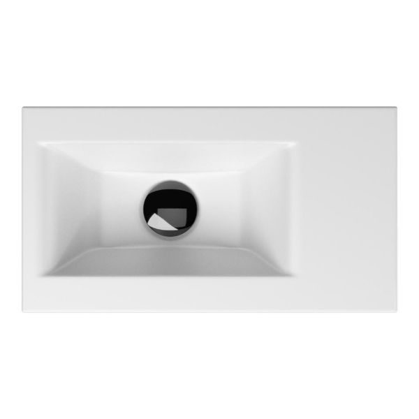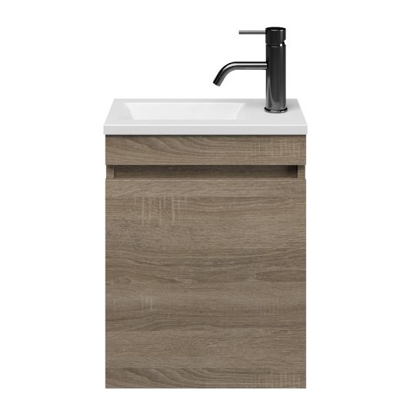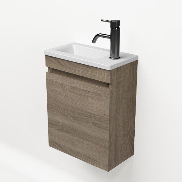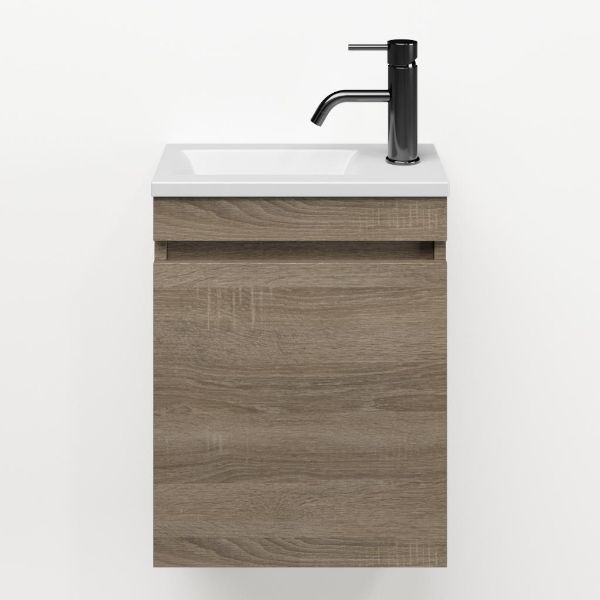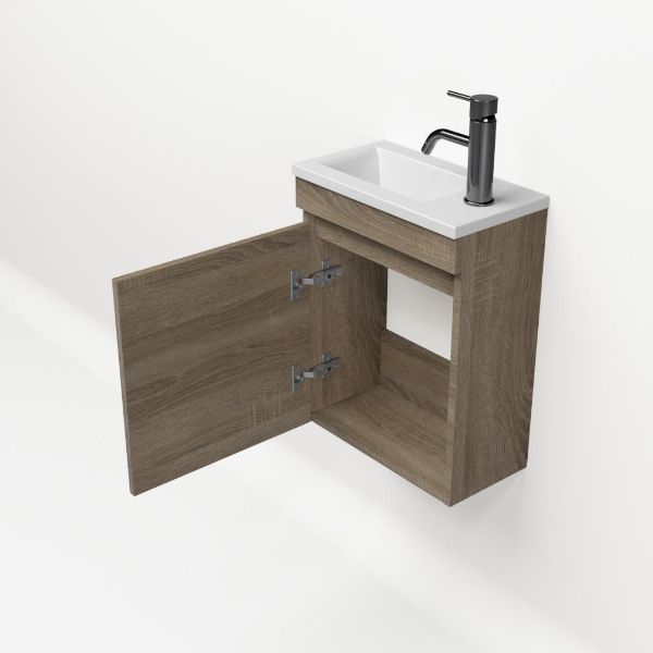 Greeploos fonteinmeubel in de kleur eiken donker is 40 cm breed. De wastafel is vervaardig in polystone en heeft de kleur wit mat keramiek met 0 kraangaten