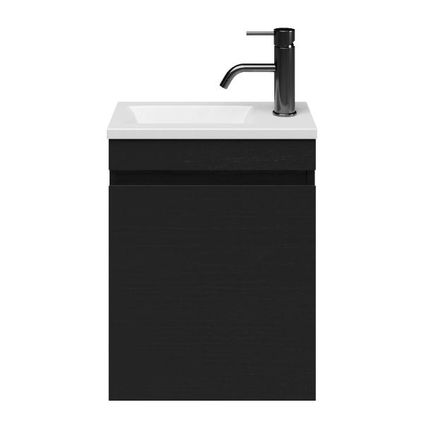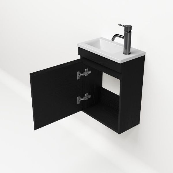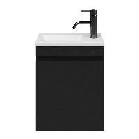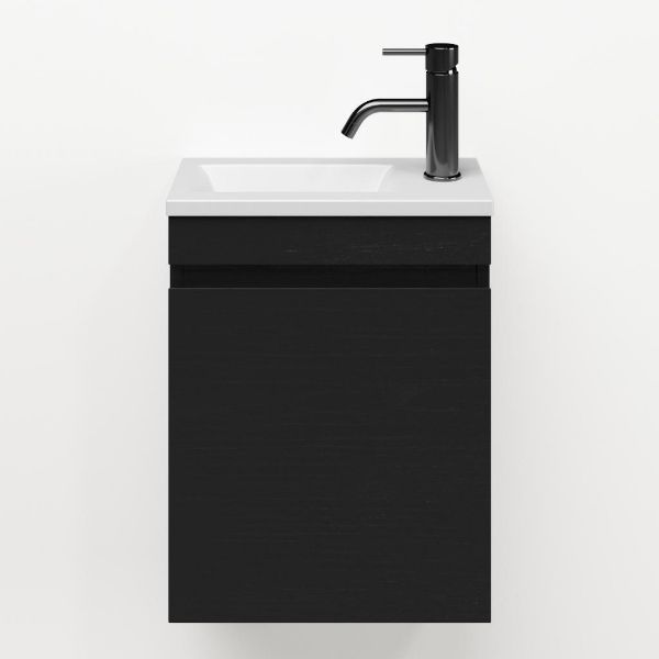 Greeploos fonteinmeubel in de kleur zwart mat eiken is 40 cm breed. De wastafel is vervaardig in polystone en heeft de kleur wit mat keramiek met 0 kraangaten