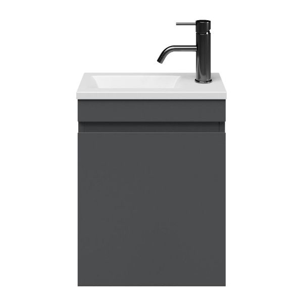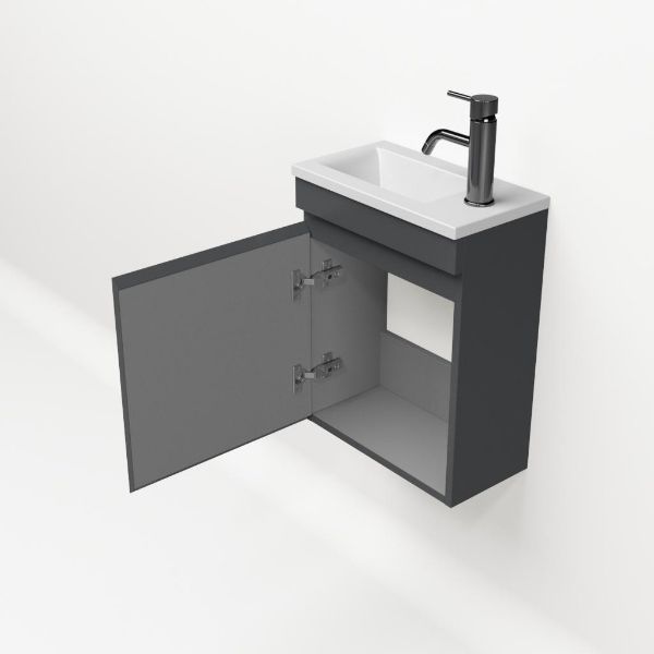 Greeploos fonteinmeubel in de kleur antraciet mat is 40 cm breed. De wastafel is vervaardig in polystone en heeft de kleur wit mat keramiek met 0 kraangaten