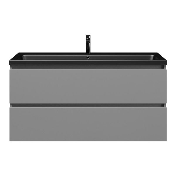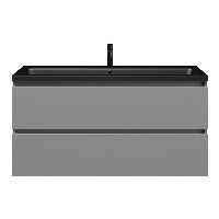 Greeploos badkamermeubel in de kleur licht grijs mat is 120 cm breed. De wastafel is vervaardig in keramiek en heeft de kleur zwart mat keramiek.