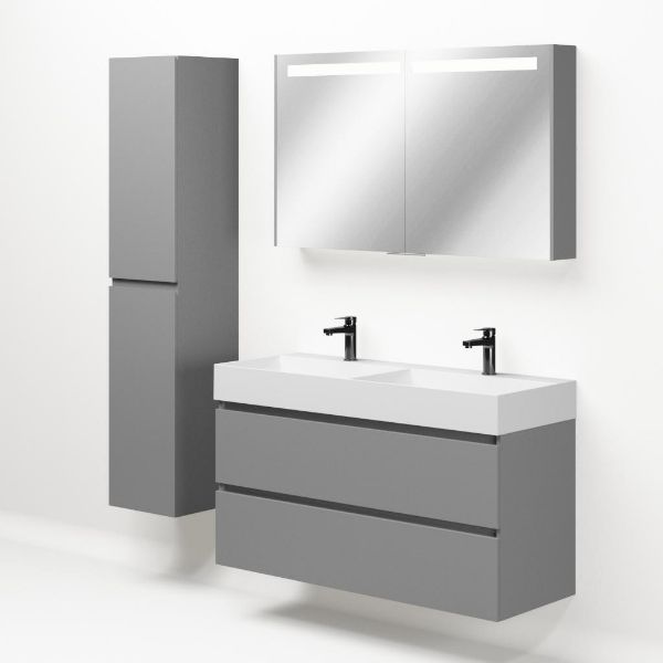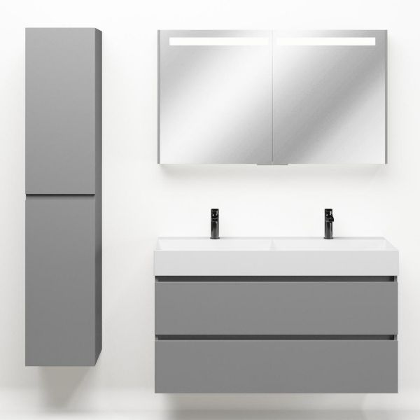 Greeploos badkamermeubel in de kleur licht grijs mat is 120 cm breed. De wastafel is vervaardig in keramiek en heeft de kleur wit keramiek.