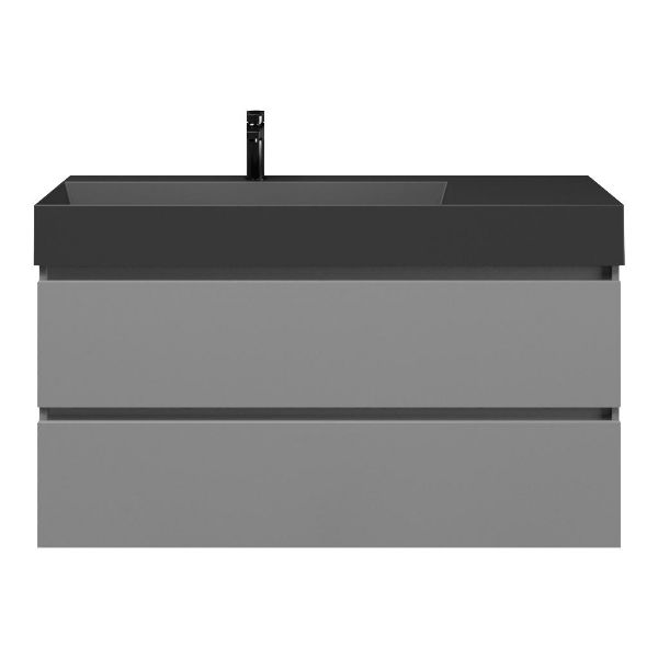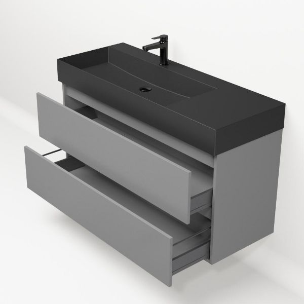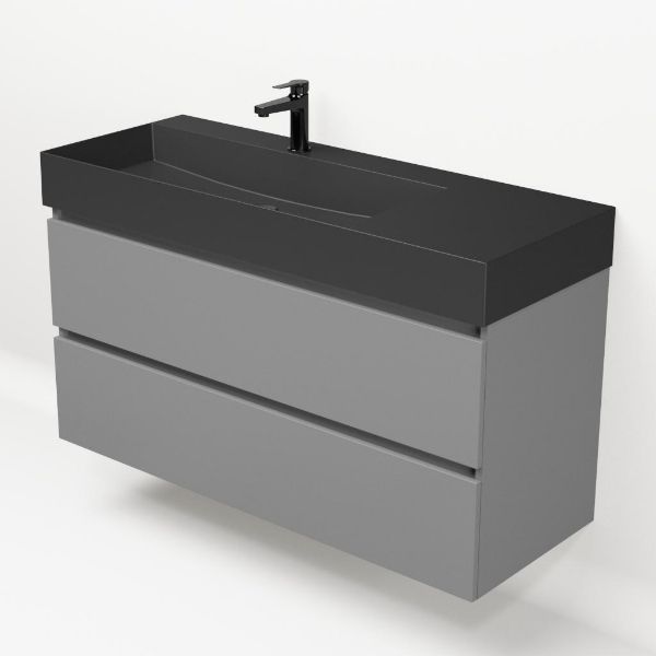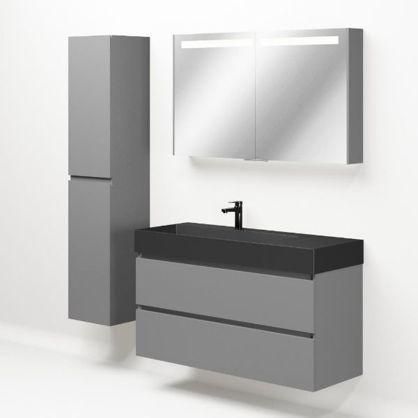 Greeploos badkamermeubel in de kleur licht grijs mat is 120 cm breed. De wastafel is vervaardig in keramiek en heeft de kleur antraciet mat keramiek.