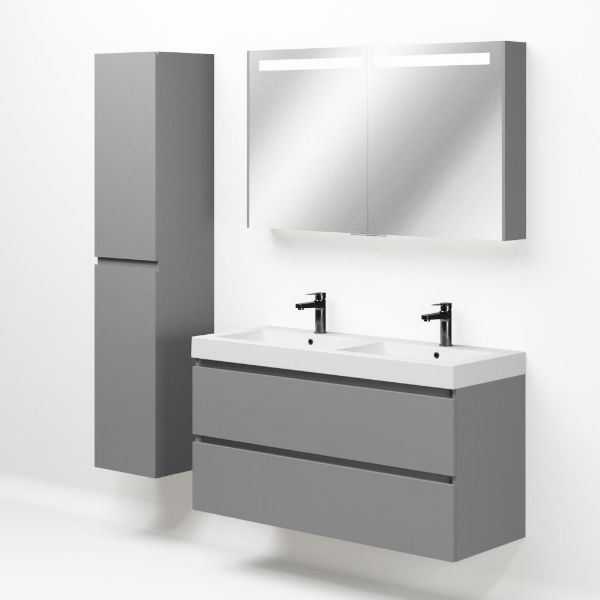 Greeploos badkamermeubel in de kleur licht grijs mat is 120 cm breed. De wastafel is vervaardig in polystone en heeft de kleur wit.