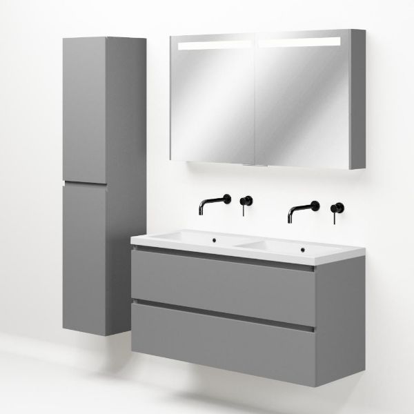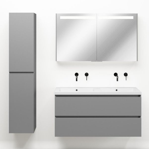 Greeploos badkamermeubel in de kleur licht grijs mat is 120 cm breed. De wastafel is vervaardig in polystone en heeft de kleur wit.
