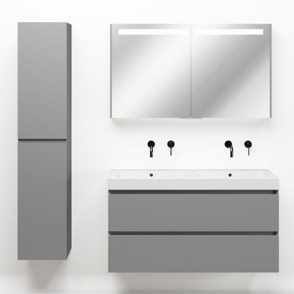 Greeploos badkamermeubel in de kleur licht grijs mat is 120 cm breed.  De wastafel is vervaardig in polystone en heeft de kleur wit.