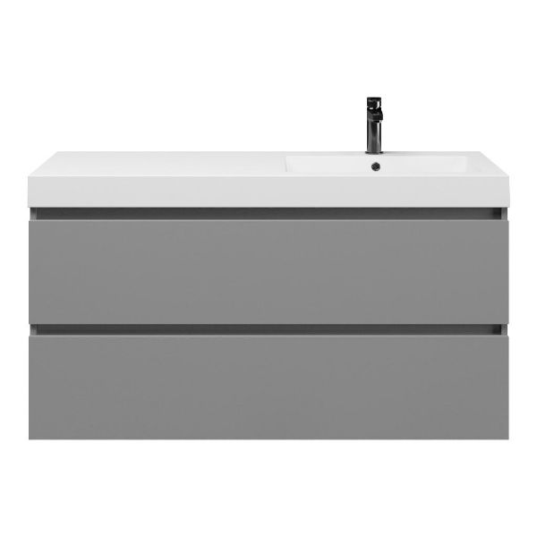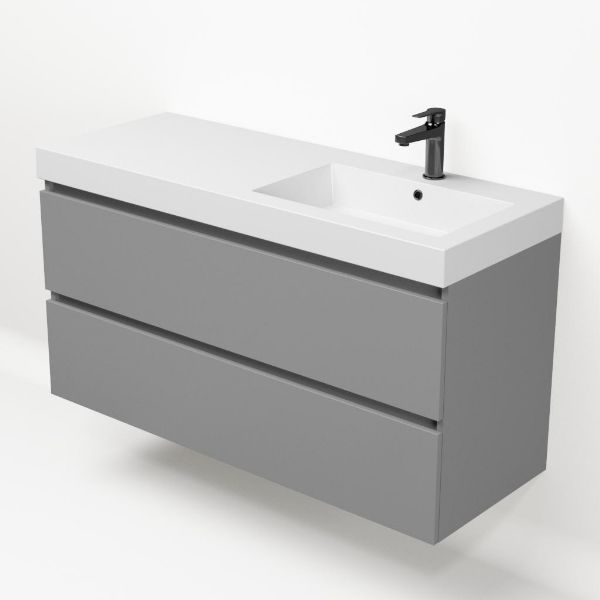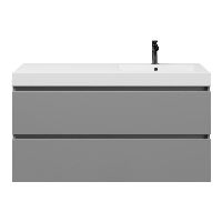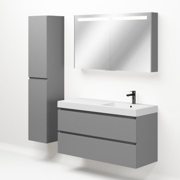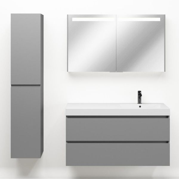 Greeploos badkamermeubel in de kleur licht grijs mat is 120 cm breed.  De wastafel is vervaardig in polystone en heeft de kleur wit.