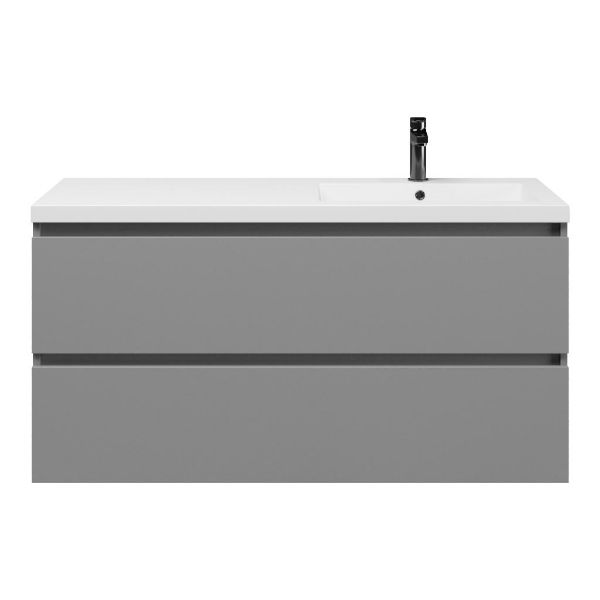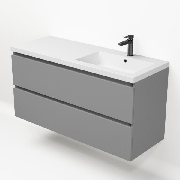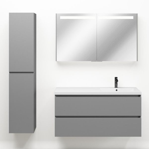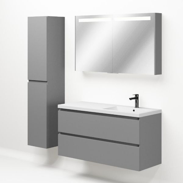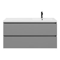 Greeploos badkamermeubel in de kleur licht grijs mat is 120 cm breed.  De wastafel is vervaardig in polystone en heeft de kleur wit.