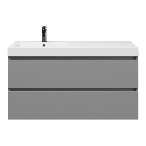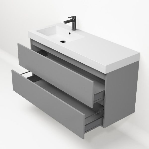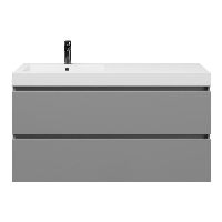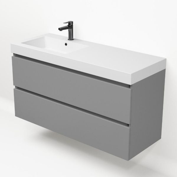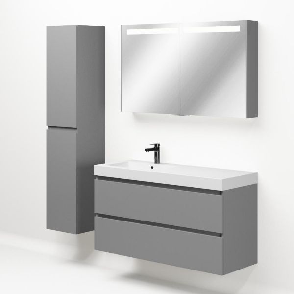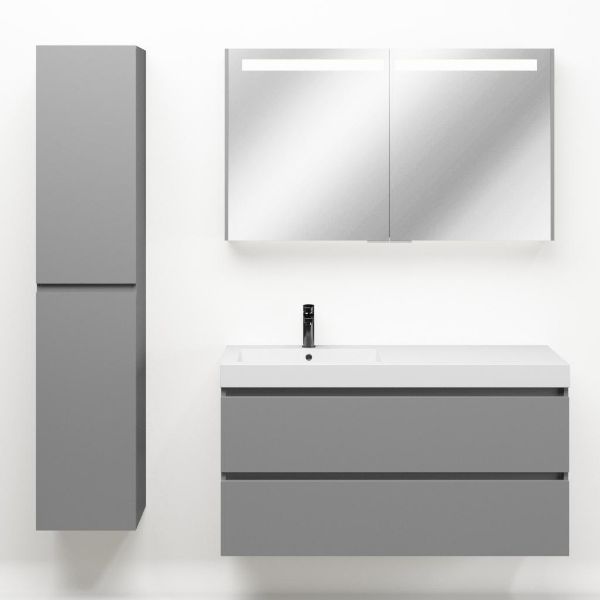 Greeploos badkamermeubel in de kleur licht grijs mat is 120 cm breed. De wastafel is vervaardig in polystone en heeft de kleur wit.