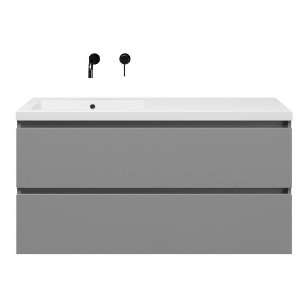 Greeploos badkamermeubel in de kleur licht grijs mat is 120 cm breed.  De wastafel is vervaardig in polystone en heeft de kleur wit.