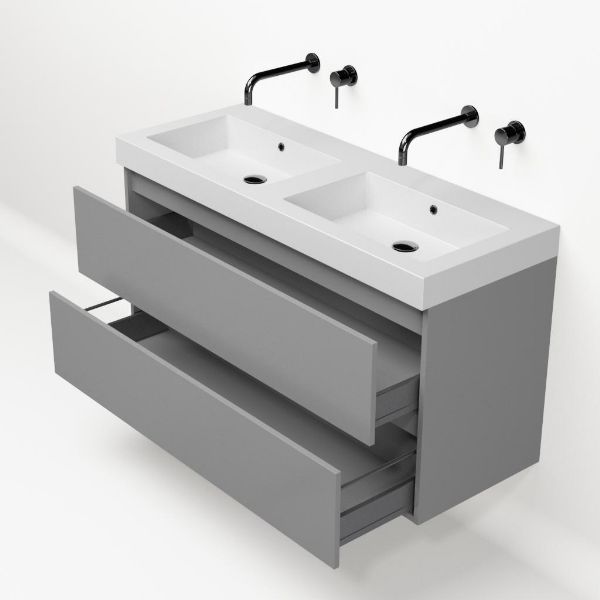 | Bellanti Fiore /Esta-Q badmeubel 120x46 2 softclose laden mat licht grijs quartz wastafel dubbel mat wit zonder kraangaten |