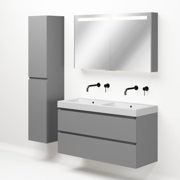 Greeploos badkamermeubel in de kleur licht grijs mat is 120 cm breed. De wastafel is vervaardig in quartz en heeft de kleur wit mat quartz.