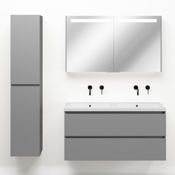 Greeploos badkamermeubel in de kleur licht grijs mat is 120 cm breed. De wastafel is vervaardig in quartz en heeft de kleur wit mat quartz.