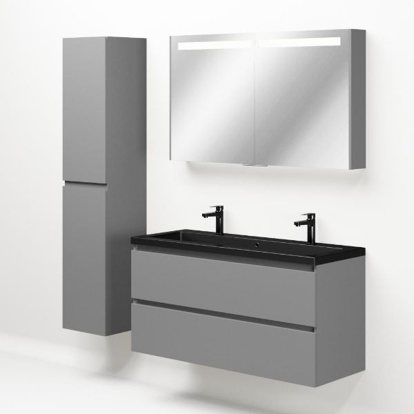Greeploos badkamermeubel in de kleur licht grijs mat is 120 cm breed. De wastafel is vervaardig in polystone en heeft de kleur zwart mat.