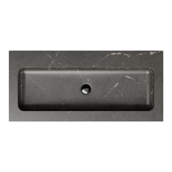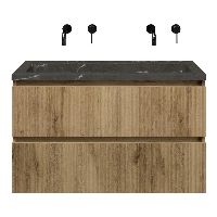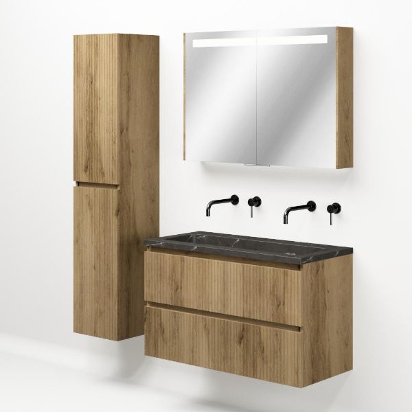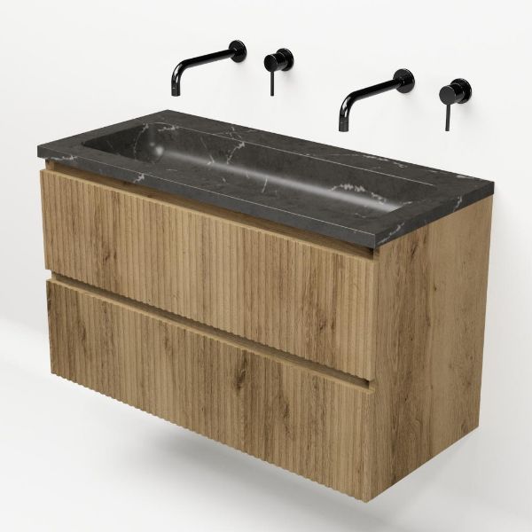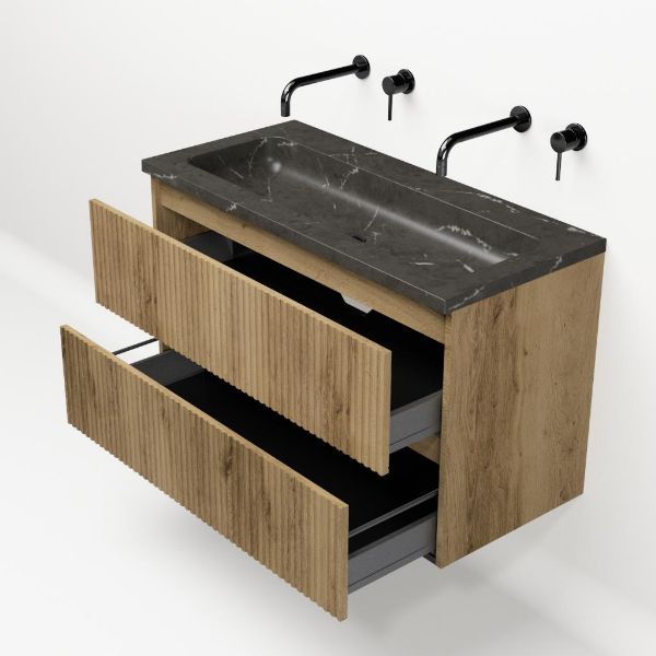 | | Bellanti Silvan/Square badmeubel 100x46 2 softclose laden met ribbel - latjes structuur warm eiken greeploos natuursteen wastafel blue stone zonder kraangaten |
