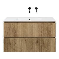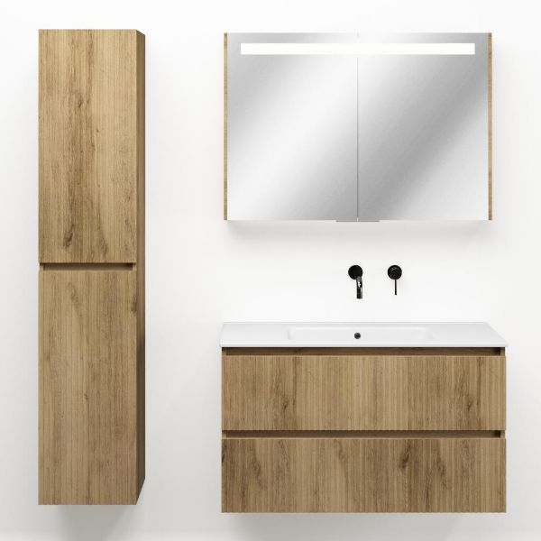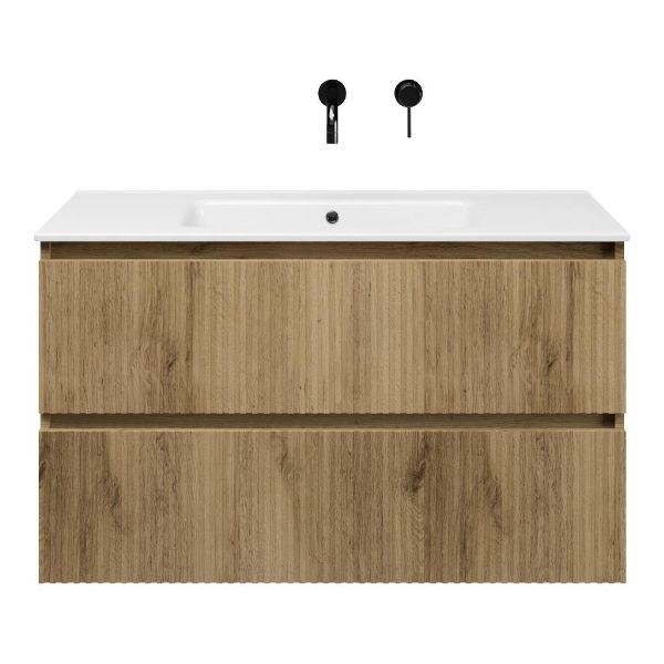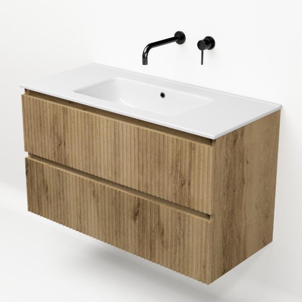Bellanti Silvan/Etna badmeubel 100x46 2 softclose laden met ribbel - latjes structuur warm eiken greeploos keramische wastafel wit zonder kraangaten
