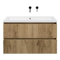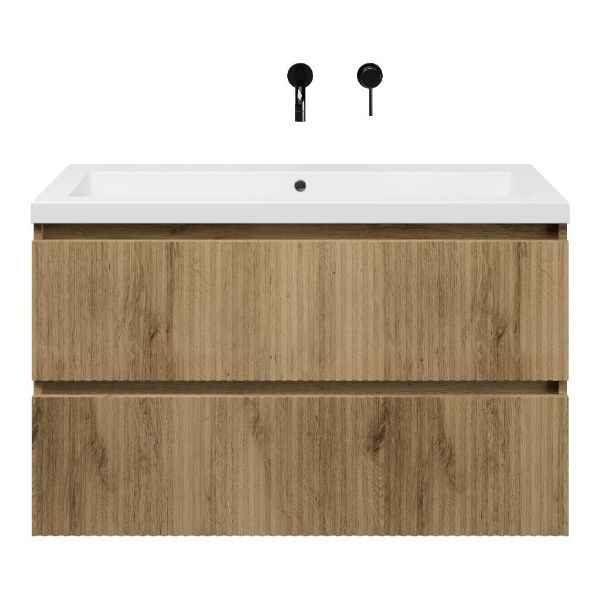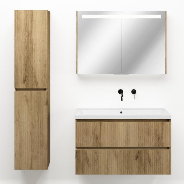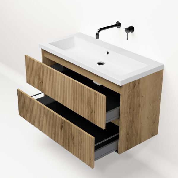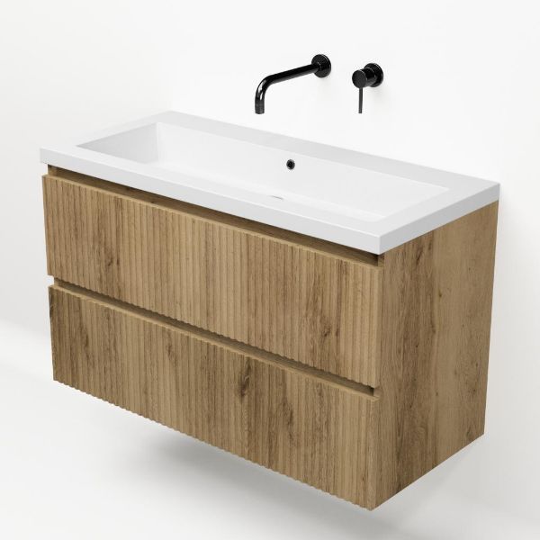 | | Bellanti Silvan/Esta badmeubel 100x46 2 softclose laden met ribbel - latjes structuur warm eiken greeploos polystone wastafel wit zonder kraangaten |