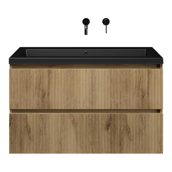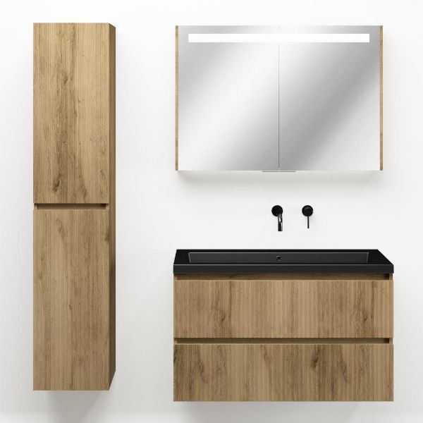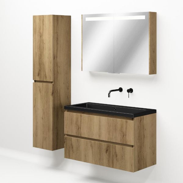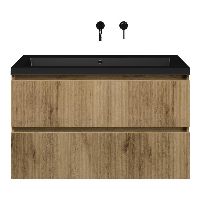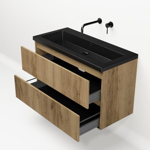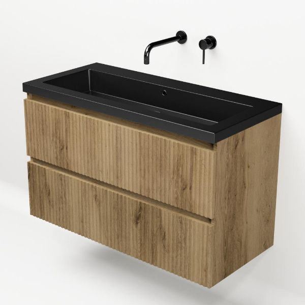 | | Bellanti Silvan/Esta badmeubel 100x46 2 softclose laden met ribbel - latjes structuur warm eiken greeploos polystone wastafel mat zwart zonder kraangaten |