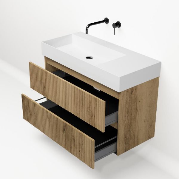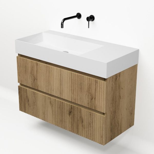 | Bellanti Silvan/Azzurra badmeubel 100x46 2 softclose laden met ribbel - latjes structuur warm eiken greeploos keramische wastafel links wit glans zonder kraangaten |