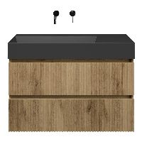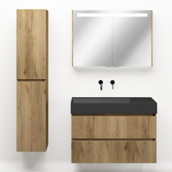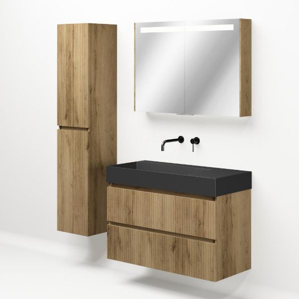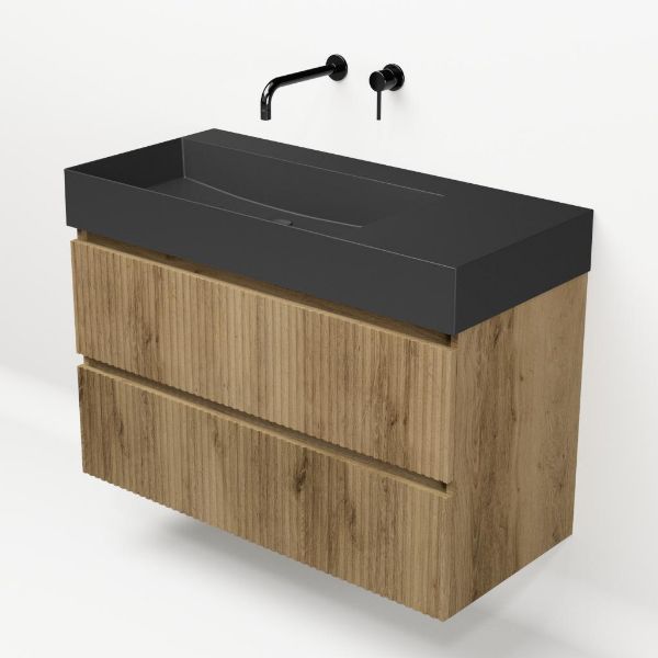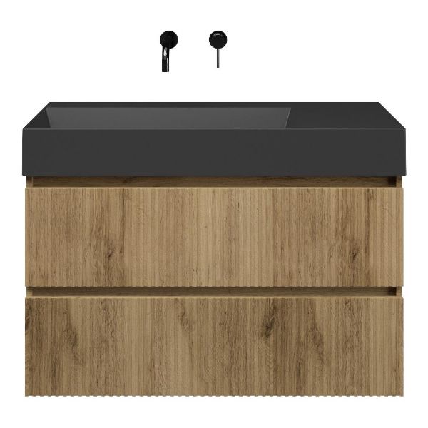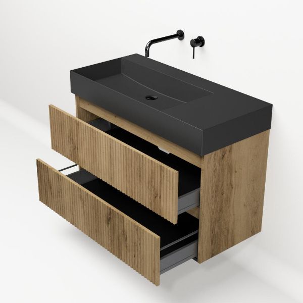 Bellanti Silvan/Azzurra badmeubel 100x46 2 softclose laden met ribbel - latjes structuur warm eiken met ribbel - latjes structuur greeploos keramische wastafel links antraciet mat zonder kraangaten