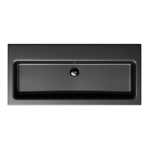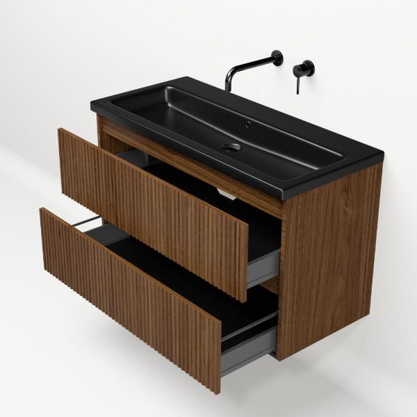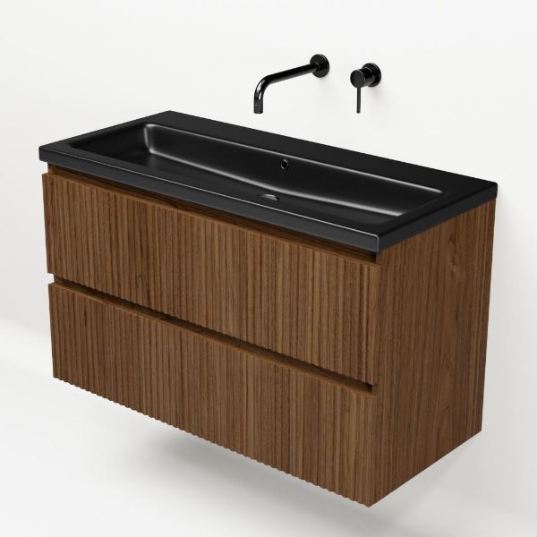 | Bellanti Silvan/Amelia badmeubel 100x46 2 softclose laden met ribbel - latjes structuur warm noten greeploos keramische wastafel zwart mat zonder kraangaten |
