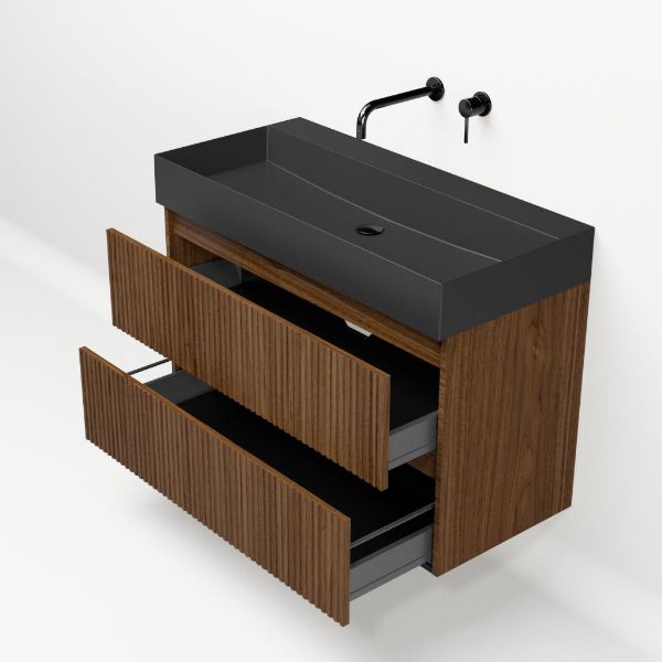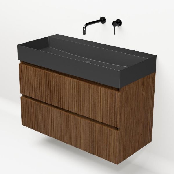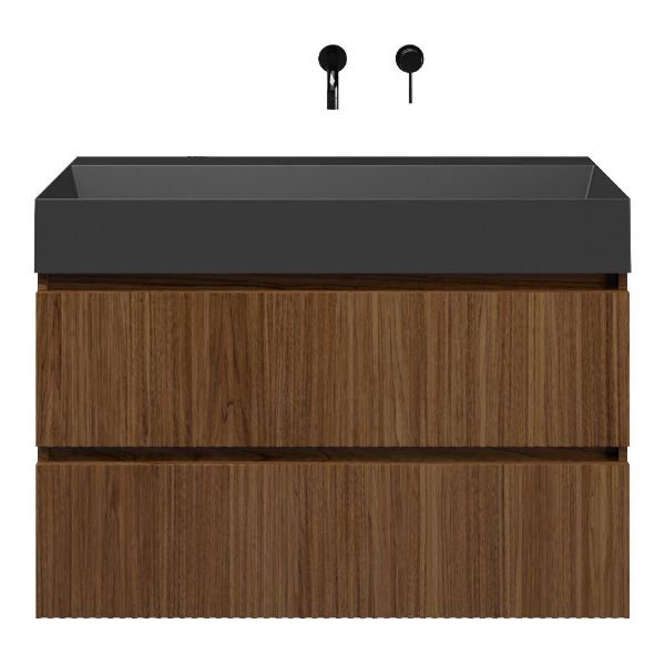 | Bellanti Silvan/Azzurra badmeubel 100x46 2 softclose laden met ribbel - latjes structuur warm noten greeploos keramische wastafel antraciet mat zonder kraangaten |